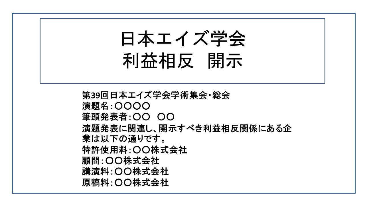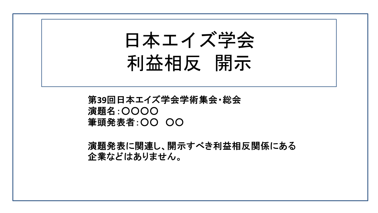 発表スライド冒頭に、発表者の利益相反の自己申告を行う事が義務付けられております。
