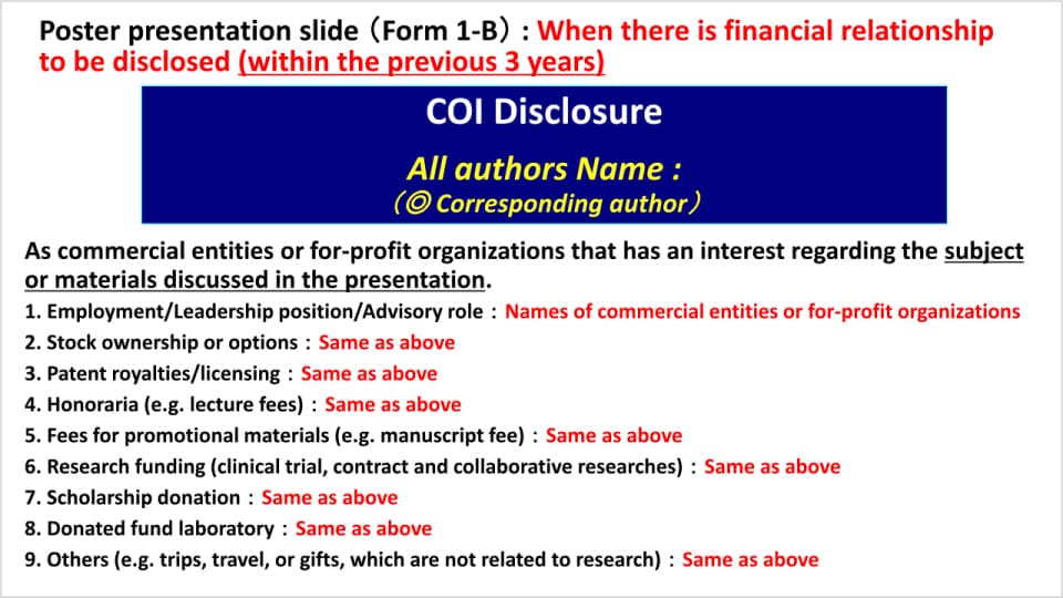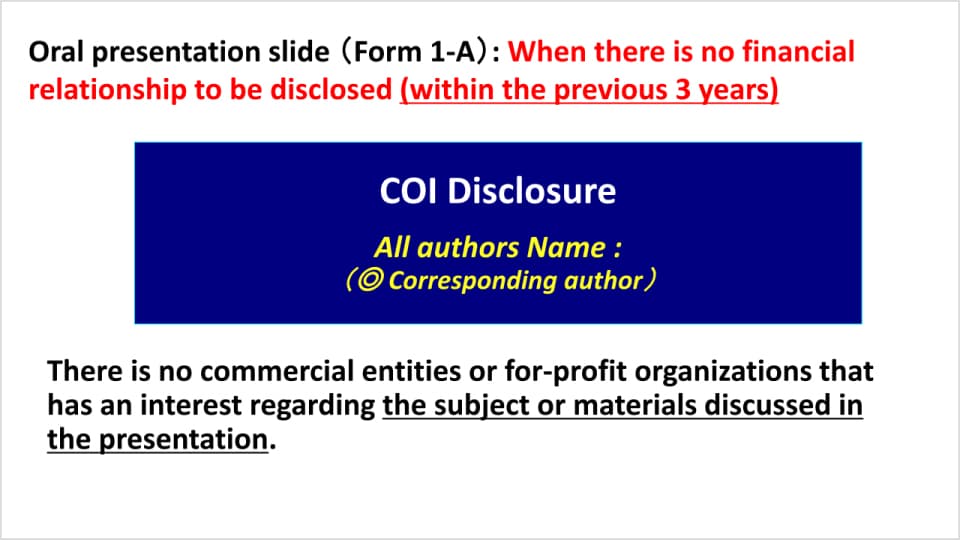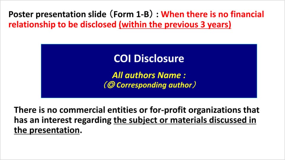 Please download the “COI Disclosure Slide Example” or prepare a slide in the same format, and include it as the first slide of your presentation or at the end of your poster.