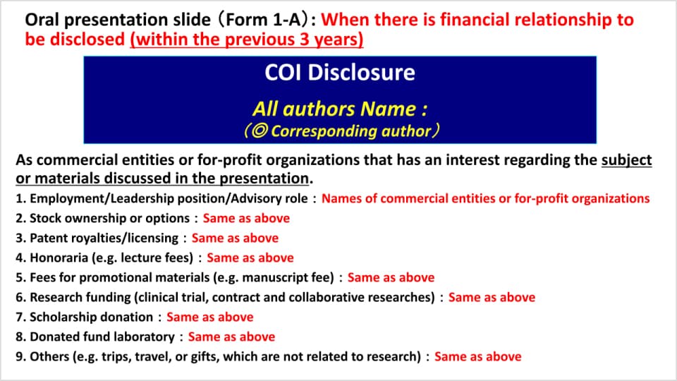 The Japan Endocrine Society requires all first authors and co-authors of oral or poster presentations to disclose any conflicts of interest. Please refer to the Society’s website below for detailed information on COI disclosure requirements.