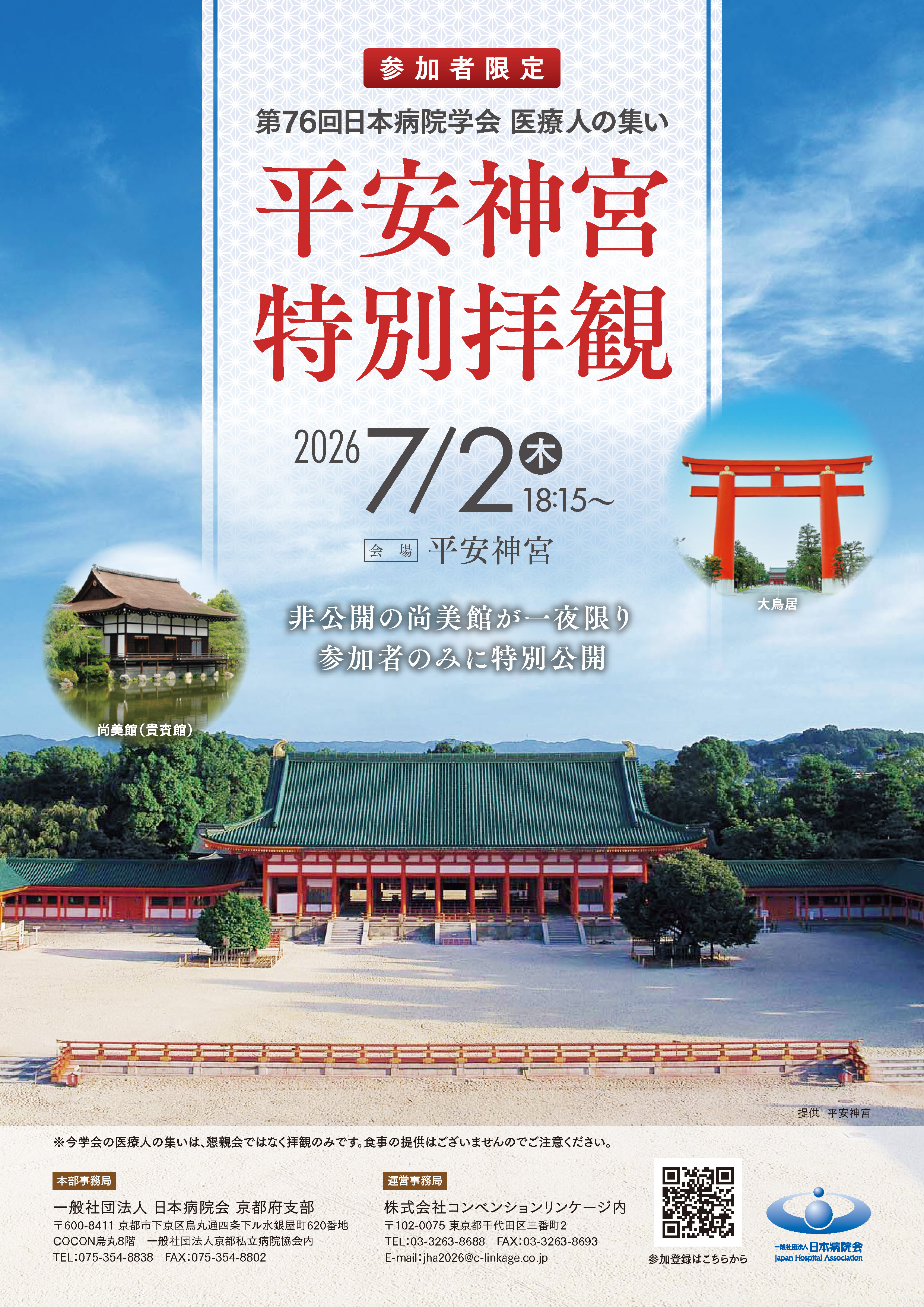 日本病院学会では例年参加者の懇親会として医療人の集いを開催しておりますが、76回大会では懇親会に代わり平安神宮での特別拝観を実施いたします。
