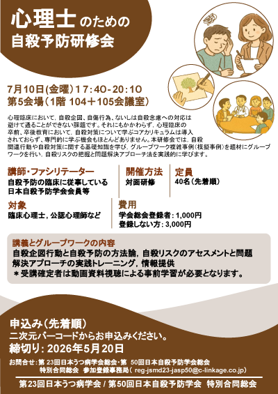 日本自殺予防学会では、総会会期中に学会公認研修会を開催いたしますが、今回はトピックスを踏まえ、より一層拡充されたものとなっております。この機会に、ぜひ参加をご検討ください。