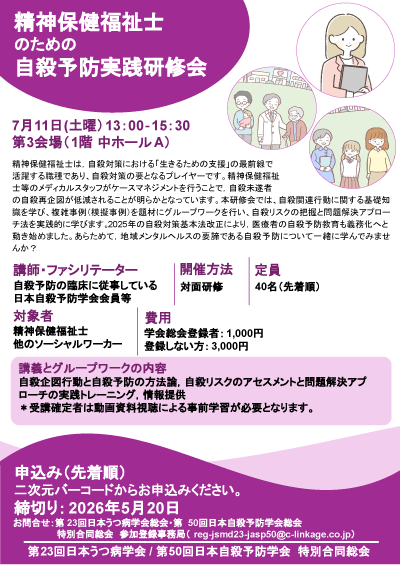 - 精神保健福祉士は,自殺対策における「生きるための支援」の最前線で活躍する職種であり、自殺対策の要となるプレイヤーです。精神保健福祉士等のメディカルスタッフがケースマネジメントを行うことで,自殺未遂者の自殺再企図が低減されることが明らかとなっています。本研修会では、自殺関連行動に関する基礎知識を学び、複雑事例(模擬事例)を題材にグループワークを行い、自殺リスクの把握と問題解決アプローチ法を実践的に学びます。2025年の自殺対策基本法改正により,医療者の自殺予防教育も義務化へと動き始めました。あらためて,地域メンタルヘルスの要諦である自殺予防について一緒に学んでみませんか?