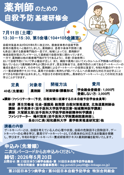- 自殺対策基本法が2025年6月に改正され,医療従事者の自殺予防教育の義務化へと動きだしました。薬剤師は,患者や身体不調者に最も身近に接する医療専門職の一員です。地域によっては,薬剤師が地域自殺対策のプレイヤーとして最前線で自殺対策に関わっています。