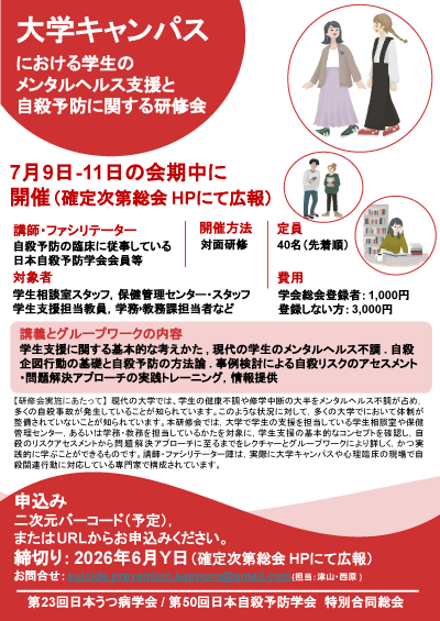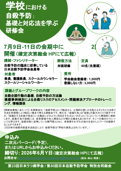 - 学校における自殺予防:基礎と対応法を学ぶ研修会