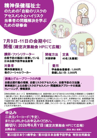 日本自殺予防学会では、総会会期中に学会公認研修会を開催いたしますが、今回はトピックスを踏まえ、より一層拡充されたものとなっております。各研修会の開催日時・参加登録方法については、後日、本ページについてご案内いたします。この機会に、ぜひ参加をご検討ください。
