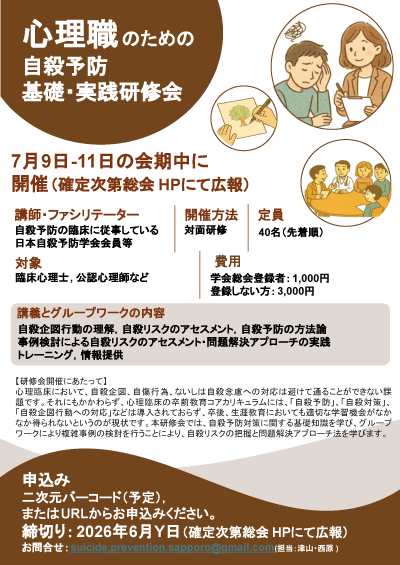 - 心理臨床において、自殺企図、自傷行為、ないしは自殺念慮への対応は避けて通ることができない課題です。それにもかかわらず、心理臨床の卒前教育コアカリキュラムには、「自殺予防」、「自殺対策」、「自殺企図行動への対応」などは導入されておらず、卒後、生涯教育においても適切な学習機会がなかなか得られないというのが現状です。本研修会では、自殺予防対策に関する基礎知識を学び、グループワークにより複雑事例の検討を行うことにより、自殺リスクの把握と問題解決アプローチ法を学びます。