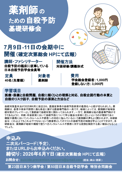 - 自殺対策基本法が2025年6月に改正され、医療従事者の自殺予防教育の義務化へと舵が切られました。薬剤師は、患者や身体不調者に最も身近に接する医療専門職の一員です。地域によっては、薬剤師が地域自殺対策のプレイヤーとして最前線で自殺対策に関わっておられます。一方で、薬剤師は他の医療専門職がそうであるように、卒前・卒後教育において自殺予防について学ぶ機会は非常に乏しいというのが現状であり、病院や薬局においてメンタルへルス不調者への対応に悩んでいるという薬剤師の声もよく聞かれます。本研修会は、これ以上でもこれ以下でもないという医療者としてのマストの自殺予防の知識を学ぶことができます。本研修会は、薬剤師が地域や病院で担うべきメンタルヘルス不調者に対する役割を検討する良い機会となることでしょう。
