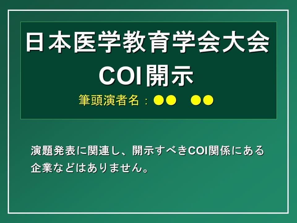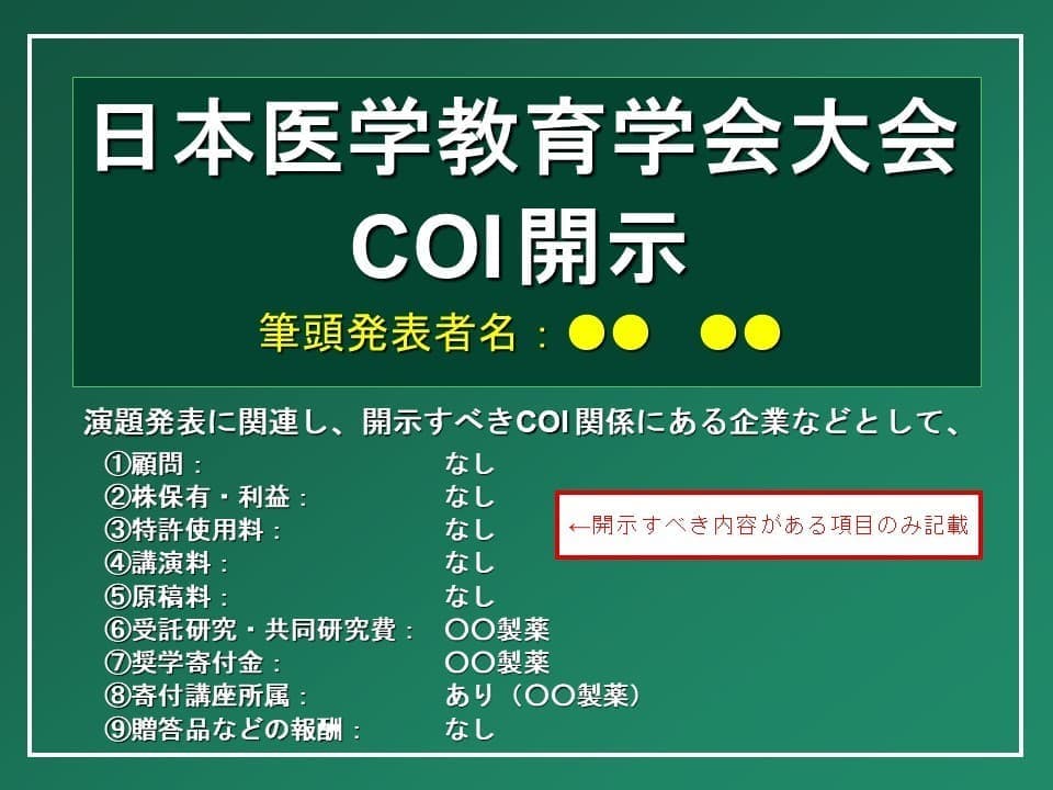 本医学教育学会大会での発表について、下記の要領で筆頭演者にCOIの開示をお願いします。