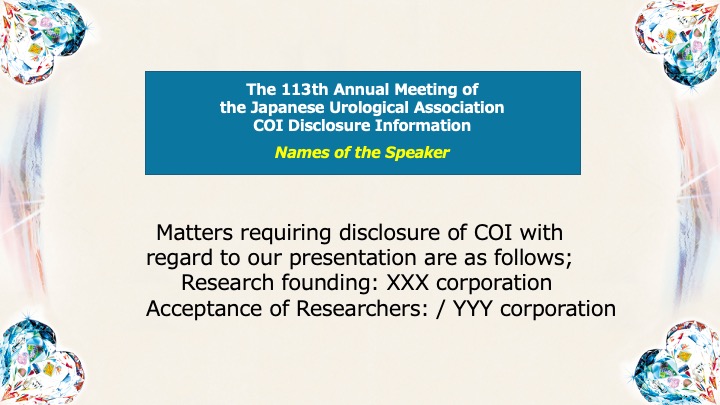 At the beginning of the presentation (or after a slide introducing the presenter, etc.), please include a slide containing a self-declaration of conflicts of interest. Please also indicate COI at poster sessions as well.