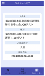 入退室のQRコードを読み取る度に参加登録を促すメッセージが表示される仕組みとなっておりますので会期中に必ず参加登録をお願いします。(参加登録を完了するとメッセージは表示されなくなります)